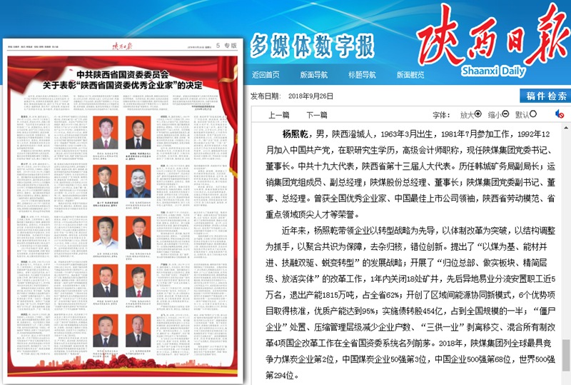 日前,陜西省國資委黨委發(fā)布了《關(guān)于表彰“陜西省國資委優(yōu)秀企業(yè)家”的決定》,陜煤集團黨委書記、董事長楊照乾被授予“陜西省國資委優(yōu)秀企業(yè)家”榮譽稱號。近年來,楊照乾帶領(lǐng)陜煤集團以轉(zhuǎn)型戰(zhàn)略為先導,以體制改革為突破,以結(jié)構(gòu)調(diào)整為抓手,以聚合共識為保障,去雜歸核,錯位創(chuàng)新。提出了“以煤為基、能材并進、技融雙驅(qū)、蛻變轉(zhuǎn)型”的發(fā)展戰(zhàn)略;開展了“歸位總部、做實板塊、精簡層級、放活實體”的改革工作,1年內(nèi)關(guān)閉18處礦井,先后異地易業(yè)分流安置職工近5萬名,退出產(chǎn)能1815萬噸,占全省62%;開創(chuàng)了區(qū)域間能源協(xié)同新模式,6個優(yōu)勢項目取得核準,優(yōu)質(zhì)產(chǎn)能達到95%;實施債轉(zhuǎn)股454億,占到全國規(guī)模的一半;“僵尸企業(yè)”處置、壓縮管理層級減少企業(yè)戶數(shù)、“三供一業(yè)”剝離移交、混合所有制改革4項國企改革工作在全省國資委系統(tǒng)名列前茅。2018年,陜煤集團列全球最具競爭力煤炭企業(yè)第2位,中國煤炭企業(yè)50強第3位,中國企業(yè)500強第68位,世界500強第294位。楊照乾曾獲全國優(yōu)秀企業(yè)家、中國最佳上市公司領(lǐng)袖,陜西省勞動模范、省重點領(lǐng)域頂尖人才等榮譽。