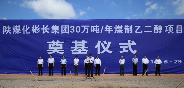 6月29日上午,陜煤化集團彬長礦業(yè)公司在彬縣小章鎮(zhèn)彬長煤化工工業(yè)廠區(qū)舉行30萬噸煤制乙二醇項目奠基儀式。咸陽市委書記姜鋒、市長衛(wèi)華,陜煤化集團董事長楊照乾,集團總經(jīng)理嚴廣勞,集團副總經(jīng)理尤西蒂、孫喜民;集團戰(zhàn)略規(guī)劃委、化工事業(yè)部負責(zé)人,彬長礦業(yè)公司黨政領(lǐng)導(dǎo),各部門、各單位負責(zé)人,員工代表等400余人參加奠基儀式。彬長礦業(yè)公司執(zhí)行董事、黨委書記李厚志主持儀式。