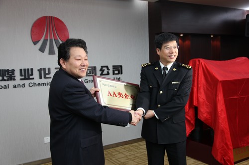陜煤化集團(tuán)副總經(jīng)理朱周岐代表集團(tuán)公司,領(lǐng)取西安海關(guān)頒發(fā)的“AA類企業(yè)”獎(jiǎng)牌