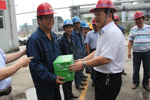 7月16日,集團公司黨委副書記、工會主席馬富元一行在陜鋼集團黨委書記李永剛、工會主席陳敏鋒陪同下到陜鋼集團漢鋼公司進行送清涼慰問活動,為暑期工作在生產(chǎn)一線的干部職工送去陜煤化集團的親切問候。