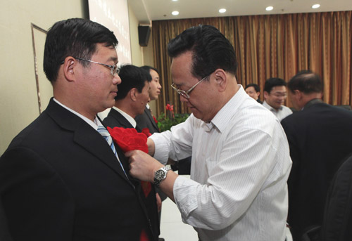 參加歡送儀式的集團(tuán)公司領(lǐng)導(dǎo)為勞模佩戴光榮花