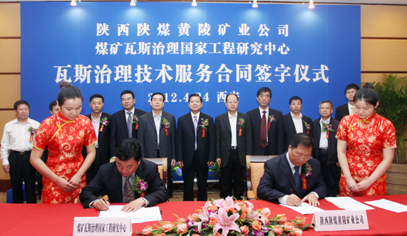 黃陵礦業(yè)公司與煤礦瓦斯治理國家工程研究中心簽署瓦斯治理技術(shù)服務(wù)合同。王新尹攝