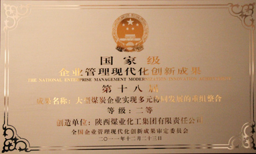 中國企業(yè)聯(lián)合會、國務(wù)院國資委企業(yè)改革局、工業(yè)和信息化部產(chǎn)業(yè)政策司和中小企業(yè)司于2012年3月24日在北京召開“2012年全國企業(yè)管理創(chuàng)新大會”。中國企業(yè)聯(lián)合會會長王忠禹、國資委副主任邵寧、工業(yè)和信息化部朱宏任總工程師等相關(guān)領(lǐng)導(dǎo)參加了會議。會議宣讀第十八屆國家級管理創(chuàng)新成果發(fā)布文件。陜西煤業(yè)化工集團(tuán)公司《大型煤炭企業(yè)實現(xiàn)多元協(xié)同發(fā)展的重組整合》成果榮獲二等獎。