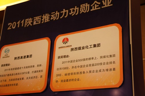 繼連續(xù)兩年獲評(píng)“2009陜西經(jīng)濟(jì)最具推動(dòng)力企業(yè)”和“2010陜西經(jīng)濟(jì)最具社會(huì)責(zé)任企業(yè)”后,陜西煤業(yè)化工集團(tuán)公司憑借2011年在經(jīng)營(yíng)業(yè)績(jī)上的強(qiáng)勢(shì)表現(xiàn)以及對(duì)陜西經(jīng)濟(jì)的強(qiáng)勢(shì)推動(dòng)又一次引發(fā)社會(huì)關(guān)注,連續(xù)第三次榮登陜西經(jīng)濟(jì)推動(dòng)力總評(píng)榜,獲評(píng)“2011陜西推動(dòng)力功勛企業(yè)”獎(jiǎng)。