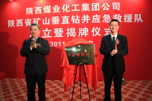 陜西煤業(yè)化工集團(tuán)董事長華煒,陜西省應(yīng)急管理辦公室張小寧主任為陜西省礦山垂直鉆井應(yīng)急救援隊(duì)揭牌