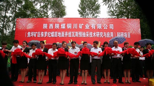 最后,與會領(lǐng)導(dǎo)為開工儀式剪彩。銅川礦業(yè)公司總經(jīng)理宋志剛宣布《焦坪礦區(qū)侏羅紀(jì)煤層地面井組瓦斯預(yù)抽采技術(shù)研究與應(yīng)用》科研項目開工。(王莉 楊春成)