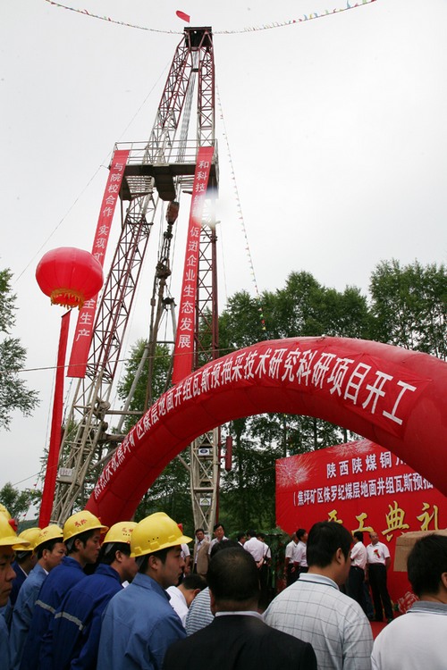 7月6日上午10時30分,冒著密集的雨滴,銅川礦業(yè)公司在下石節(jié)礦二號風(fēng)井隆重舉行《焦坪礦區(qū)侏羅紀(jì)煤層地面井組瓦斯預(yù)抽采技術(shù)研究與應(yīng)用》鉆井開工剪彩儀式。陜西煤業(yè)化工集團公司副總經(jīng)理閔龍,銅川礦業(yè)公司總經(jīng)理宋志剛,公司黨委書記黃河,中煤科工集團西安研究院院長董書寧、黨委書記王澤進,銅川礦業(yè)有限公司副總經(jīng)理、總工程師劉啟科、副總經(jīng)理封建利,中煤科工集團西安研究院副院長張群、虎維岳,公司副總工程師以及公司調(diào)度室、財務(wù)部、機械動力部、宣傳部、行政辦公室、黨委辦公室、技術(shù)開發(fā)部等部室領(lǐng)導(dǎo)和中煤科工集團西安研究院科研處、經(jīng)營處、生產(chǎn)處、黨委辦公室和地質(zhì)所等部門的領(lǐng)導(dǎo),銅川礦業(yè)公司下石節(jié)煤礦黨政領(lǐng)導(dǎo)、干部職工共200余人參加開工典禮。