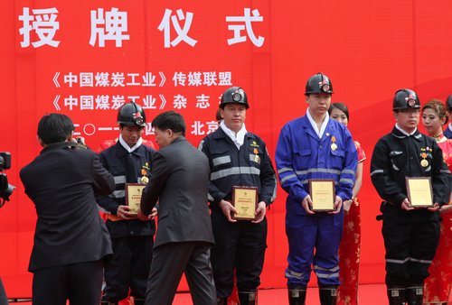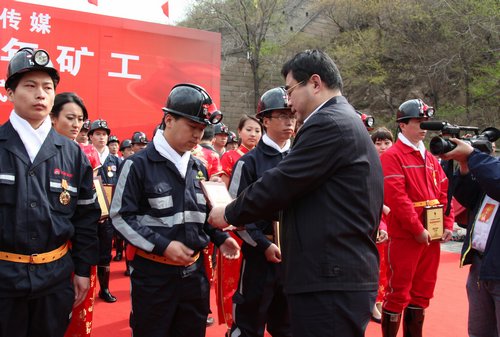 “我們倡議:把不斷學(xué)習(xí)作為一種精神追求,把不斷創(chuàng)新作為一個(gè)奮斗目標(biāo),把勤儉節(jié)約作為一種生活習(xí)慣,把安全生產(chǎn)作為一種自覺行為,把關(guān)愛生命作為一種社會(huì)責(zé)任……”4月22日,主題為“見證?長(zhǎng)城?礦工”的頒牌活動(dòng)在八達(dá)嶺水關(guān)長(zhǎng)城舉行,與會(huì)領(lǐng)導(dǎo)為獲獎(jiǎng)礦工頒獎(jiǎng),獲獎(jiǎng)礦工代表宣讀了倡議書。4月23日清晨,百名優(yōu)秀青年礦工在天安門廣場(chǎng)觀看了升旗儀式,并進(jìn)行了宣誓。隨后,在人民大會(huì)堂舉行百名優(yōu)秀青年礦工群雕式新聞發(fā)布儀式?!斑@是光榮與夢(mèng)想的交響,這是570萬礦工的驕傲”,當(dāng)人民大會(huì)堂新聞發(fā)布廳雄渾的音樂響起,燈光漸暗,礦燈齊明,礦工們閃耀亮相。