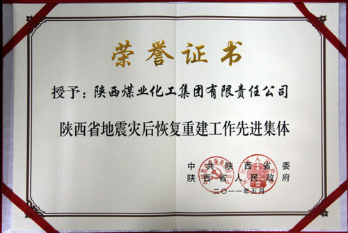 陜煤化集團榮獲的“陜西省地震災后恢復重建工作先進集體”榮譽證書
