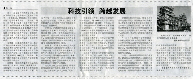 在煤制烯烴方面,取得了世界領(lǐng)先的專利技術(shù)。繼2006年成功合作開發(fā)甲醇制低碳烯烴(DMTO)技術(shù)后,又合作研發(fā)出新一代DMTO-II技術(shù)并通過了成果鑒定。該技術(shù)的推出,入選“2010年中國十大科技進展新聞”。目前,這項技術(shù)正由集團下屬的蒲城清潔能源公司付諸實踐。