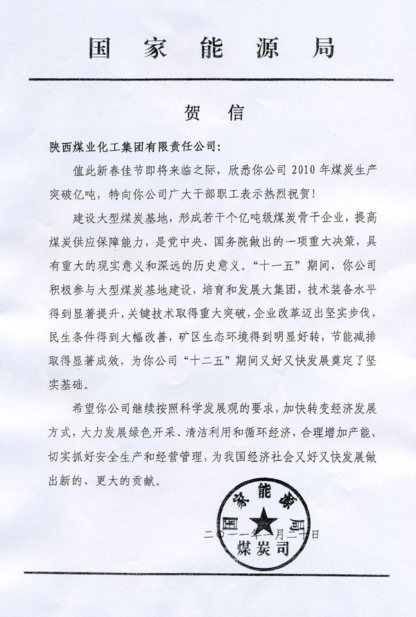 日前,陜西煤業(yè)化工集團公司收到了來自國家能源局的賀信,祝賀集團公司2010年煤炭生產(chǎn)突破億噸,賀信特向集團公司廣大干部職工表示熱烈祝賀!