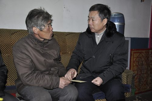 陜煤化集團(tuán)副總經(jīng)理朱周岐(左)看望白水礦病亡職工陳礦生的遺屬王彩琴。