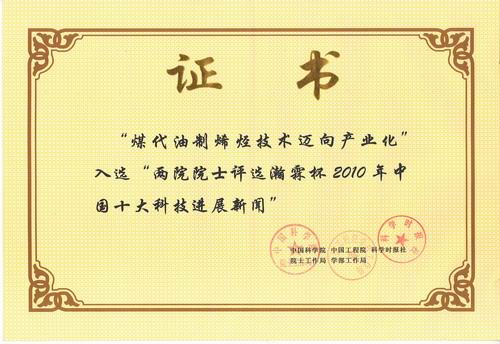 由中國科學(xué)院院士工作局、中國工程院學(xué)部工作局和科學(xué)時報社共同主辦,557名中國科學(xué)院院士和中國工程院院士投票評選,瀚霖杯2010年中國十大科技進展新聞和世界十大科技進展新聞,2011年1月19日在北京揭曉。陜西煤業(yè)化工集團有限責(zé)任公司“煤代油制烯烴技術(shù)邁向產(chǎn)業(yè)化”光榮入選2010年中國十大科技進展新聞。