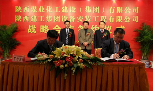 建設(shè)集團公司董事長、黨委書記魏效農(nóng)在致辭中講到,建設(shè)集團重組成立兩年來,在陜煤化集團的正確領(lǐng)導(dǎo)和大力支持下,始終按照“在做好中做大,在做優(yōu)中做強”的發(fā)展思路,把陜煤內(nèi)部市場作為起飛的跑道,把開拓外部市場作為做大做強的制高點,內(nèi)抓管理強素質(zhì),外拓市場樹形象,積極從依靠陜煤項目保生存向依托陜煤品牌促發(fā)展轉(zhuǎn)變,從施工總承包向工程總承包轉(zhuǎn)變,從低端市場向高端市場提升,經(jīng)濟規(guī)模逐年擴大,發(fā)展質(zhì)量不斷提高,“煤化建設(shè)”品牌顯現(xiàn)出勃勃生機,2009年實現(xiàn)營業(yè)收入34億元,今年預(yù)計可實現(xiàn)營業(yè)收入40億元以上。建設(shè)集團與陜西建工集團設(shè)備安裝公司同屬建筑施工企業(yè),經(jīng)營業(yè)務(wù)有著很多的相似性和互補性,本著“優(yōu)勢互補,合作共贏”的理念,雙方經(jīng)過多次醞釀和磋商,達(dá)成了“合作成就共贏,共贏引領(lǐng)共同發(fā)展”的共識,成就了雙方的戰(zhàn)略合作。