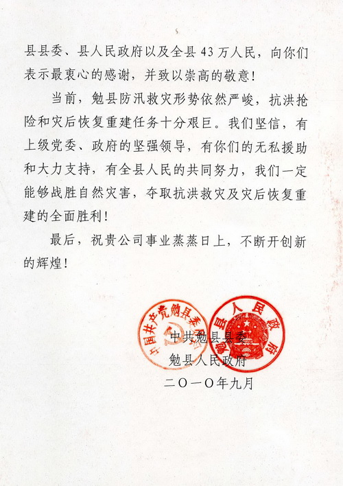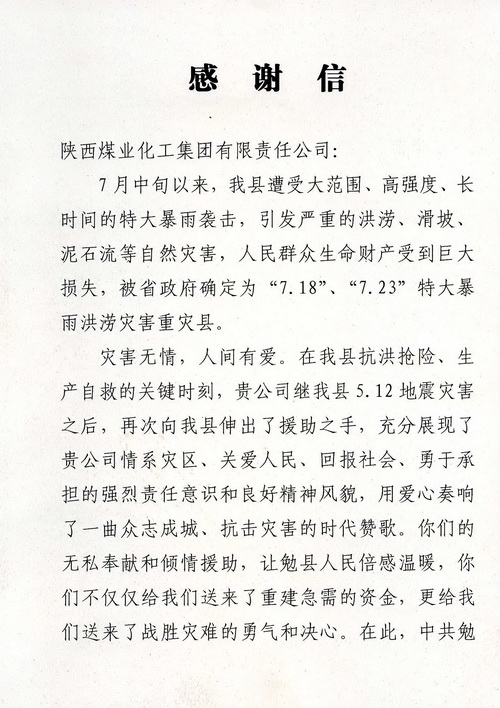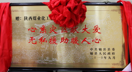 座談中,勉縣縣長李芳代表縣委、縣政府及全縣43萬人民,對陜煤化集團在今年“7.18”、“7.23”特大暴雨洪災中,向勉縣伸出無私援助和災后恢復重建工作的大力支持表示衷心感謝。并送來感謝信和寫有“心系災區(qū)獻大愛,無私援助暖人心”牌匾,表達了災區(qū)人民的感恩之情。她說,援助災區(qū)充分體現(xiàn)了陜煤化集團情系災區(qū)、關愛人民、回報社會、勇于承擔的社會責任意識和良好的精神風貌,有陜煤化集團的大力支持,全縣人民一定能奪取抗洪救災和災后恢復重建的全面勝利。在聽取了勉縣領導對暴雨洪災恢復重建工作的開展情況匯報后,總經(jīng)理高仰才講到,恢復重建的工作方案措施得力,進展很快,相信勉縣領導班子能夠克服一切困難做好重建工作。他說,陜煤化集團在快速發(fā)展的同時,也盡最大的能力承擔著一個國有企業(yè)應盡的社會責任義務。近幾年來,累計為社會捐款1.1億元,并在抗擊冰凍災害、支援地震災區(qū)建設、社會扶貧等方面發(fā)揮國有企業(yè)應有的作用。