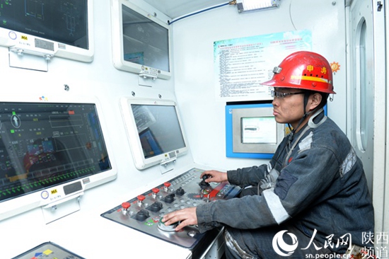 陜煤集團(tuán)黃陵礦業(yè)公司智能化無人綜采工作面,采煤工人在順槽監(jiān)控中心內(nèi)進(jìn)行遠(yuǎn)程采煤作業(yè)。