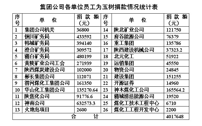 陜西煤業(yè)化工集團(tuán)公司為玉樹地震捐款901.7萬元