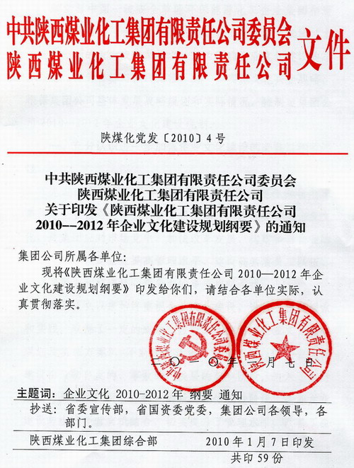 為明確企業(yè)文化建設(shè)的總體設(shè)想、方針目標(biāo)與推進(jìn)路徑,進(jìn)一步實施文化興企戰(zhàn)略,近日,陜西煤業(yè)化工集團(tuán)經(jīng)過多方征求意見,依據(jù)集團(tuán)公司現(xiàn)階段整體發(fā)展戰(zhàn)略規(guī)劃和實際情況,以黨政聯(lián)合文件印發(fā)了《陜西煤業(yè)化工集團(tuán)有限責(zé)任公司2010—2012年企業(yè)文化建設(shè)規(guī)劃綱要》。