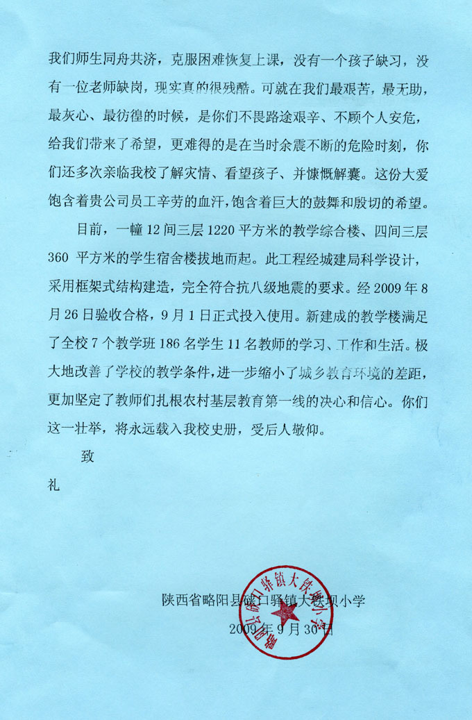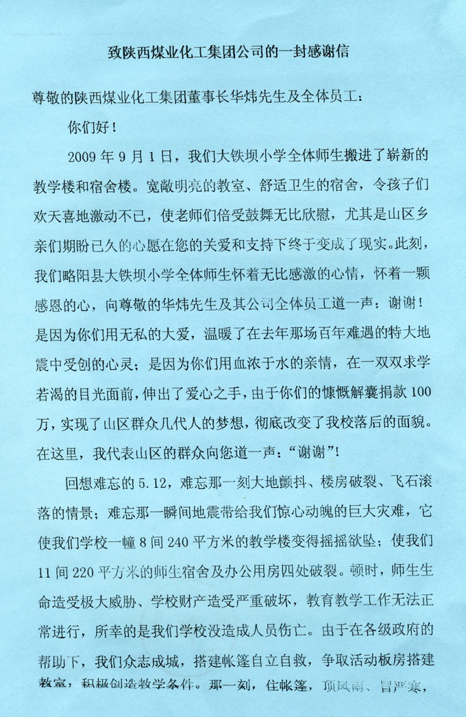 “2009年9月1日,我們大鐵壩小學(xué)全體師生搬進(jìn)了嶄新的教學(xué)樓和宿舍樓……全體師生懷著無比感激的心情,懷著一顆感恩的心,向尊敬的華煒先生及其公司全體員工道一聲:謝謝!……”日前,一封來自地震災(zāi)區(qū)陜西省略陽(yáng)縣硤口驛鎮(zhèn)大鐵壩小學(xué)的感謝信寄到了陜西煤業(yè)化工集團(tuán)公司,對(duì)該集團(tuán)公司捐款幫助該校重建教學(xué)樓和宿舍樓表示衷心的感謝。