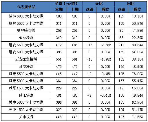 關(guān)中地區(qū),本周動力煤市場整體平穩(wěn)運行,三個代表品規(guī)格較上期均持平。其中,坑口報價:韓城Q4300貧瘦混煤含稅價在340-360元/噸之間;澄城Q4500貧瘦混煤含稅價在300-320元/噸之間,Q5500貧瘦混煤含稅價在450-480元/噸之間;銅川Q5000長焰混煤含稅價在370-380元/噸之間;寶雞Q5000長焰煤含稅價458元/噸左右。