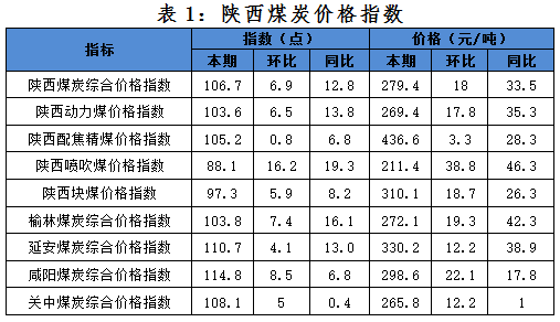 陜西綜合價(jià)格指數(shù)大幅上漲。從品種指數(shù)來(lái)看,動(dòng)力煤指數(shù)、塊煤指數(shù)、配焦精煤指數(shù)和噴吹煤指數(shù)均有不同幅度上漲,其中噴吹煤指數(shù)在經(jīng)歷長(zhǎng)期穩(wěn)定后漲幅較大;從區(qū)域指數(shù)來(lái)看,陜西省內(nèi)四個(gè)主要產(chǎn)煤區(qū)價(jià)格指數(shù)均有上漲,漲幅均超過(guò)4個(gè)點(diǎn);從代表規(guī)格品數(shù)據(jù)來(lái)看,本期陜西煤炭?jī)r(jià)格指數(shù)監(jiān)測(cè)15個(gè)代表規(guī)格品中14個(gè)上漲,1個(gè)持平,漲幅最大為22.5%。