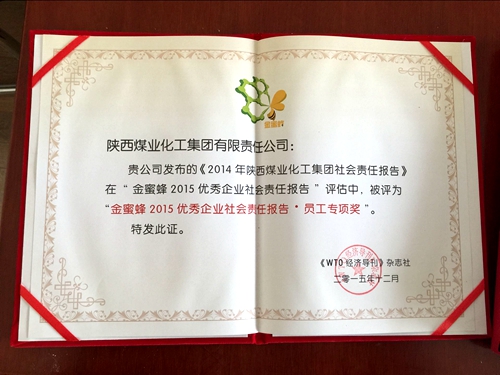 “金蜜蜂2015優(yōu)秀企業(yè)社會(huì)責(zé)任報(bào)告·員工專項(xiàng)獎(jiǎng)”是中國企業(yè)披露員工履責(zé)信息的優(yōu)秀代表?;顒?dòng)主辦方對《2014年陜西煤業(yè)化工集團(tuán)社會(huì)責(zé)任報(bào)告》的評價(jià)是:報(bào)告緊扣“共克時(shí)艱 成就員工夢想”之主題,秉承“一切為了發(fā)展,一切為了員工”的企業(yè)宗旨,將人性、務(wù)實(shí)的管理理念,融入于員工基本權(quán)益、健康安全維護(hù)、職業(yè)發(fā)展、生活質(zhì)量、企業(yè)文化建設(shè)等方面的責(zé)任實(shí)踐。是一份詮釋企業(yè)積極履行員工責(zé)任的優(yōu)秀報(bào)告。