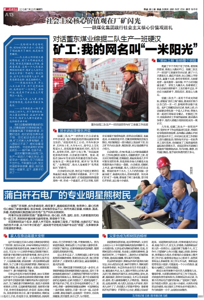 綜掘二隊(duì)生產(chǎn)一班的班工長(zhǎng)白會(huì)斌也不咋會(huì)說(shuō)話,他介紹起班組的情況就跟背課文似的,“班組現(xiàn)有員工13名,平均年齡29歲,本科生1名、大專(zhuān)生4人、高中以上文化程度8人,班組配備有掘進(jìn)機(jī)司機(jī)、絞車(chē)司機(jī)、皮帶機(jī)司機(jī)、支護(hù)工電工等?!钡f(shuō)起班組獲得的榮譽(yù),白會(huì)斌眉開(kāi)眼笑。他說(shuō),班組在2014年完成全隊(duì)所有掘進(jìn)任務(wù)的42%,沒(méi)發(fā)生過(guò)一例違章事故,被評(píng)為“優(yōu)秀班組”、“金牌班組”,他本人也被授予“優(yōu)秀班組長(zhǎng)”的稱(chēng)號(hào)。
