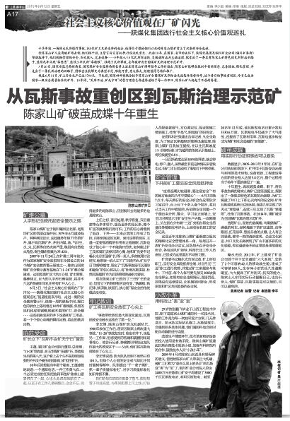 十多年前,一場(chǎng)特大瓦斯爆炸事故,166位礦工兄弟生命的逝去,使得位于煤城銅川以北的陳家山煤礦背上了沉重的安全包袱。但陳家山礦人沒有被礦難擊倒,他們擦干淚,立誓言與災(zāi)害抗?fàn)?療傷洗禮重生。此后10年,在國(guó)家、省市的關(guān)懷下,陜煤化集團(tuán)及銅川礦業(yè)公司(銅川礦務(wù)局)幫助扶持下,他們鐵腕管理保安全、加大投入、完善設(shè)備……9年投入5.8億瓦斯綜治錢,變被動(dòng)防治為主動(dòng)治理,探索出了一條具有陳家山礦特色的瓦斯防治新路子,連續(xù)九年實(shí)現(xiàn)“零隱患”、連續(xù)三年瓦斯“零超限”,杜絕了瓦斯事故,去年被評(píng)為全國(guó)煤礦瓦斯治理示范礦井。