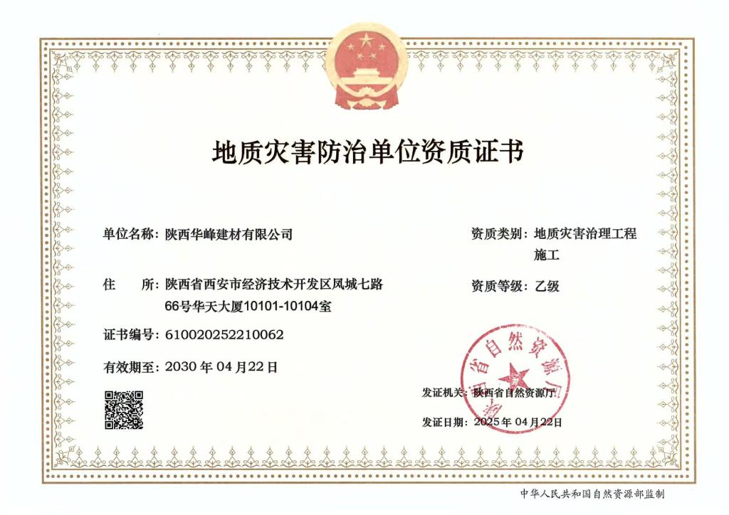 近日,華峰公司經(jīng)陜西省自然資源廳審查核準(zhǔn),順利獲得“地質(zhì)災(zāi)害治理工程施工乙級(jí)”資質(zhì),標(biāo)志著該公司在生態(tài)治理領(lǐng)域的競(jìng)爭(zhēng)力實(shí)現(xiàn)跨越式提升,為企業(yè)高質(zhì)量、多元化發(fā)展注入了新的活力。
