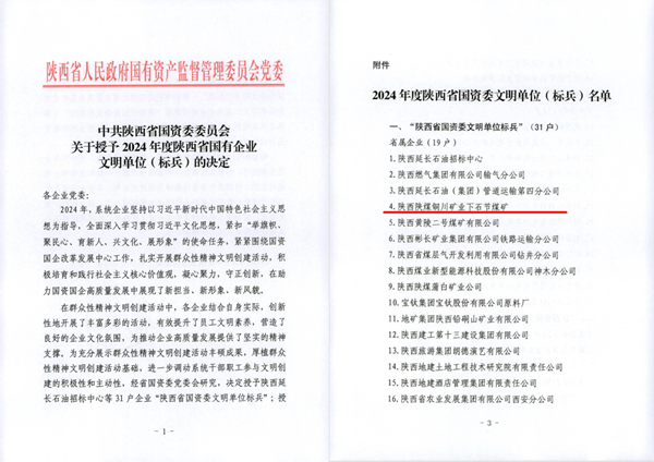 近日,陜西省國資委公布了2024 年度文明單位(標兵)名單,下石節(jié)礦榮獲 “陜西省國有企業(yè)文明單位標兵” 稱號。