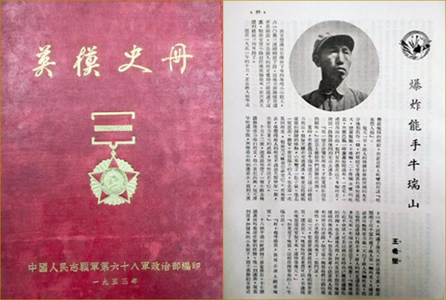 文中關(guān)于牛瑞山在文登川戰(zhàn)役中的相關(guān)史料摘錄自1953年中國人民志愿軍第六十八軍政治部編印出版的《英模史冊》?!队⒛J穬浴烽L245毫米,寬180毫米,紅色綢面精裝本,共118頁。