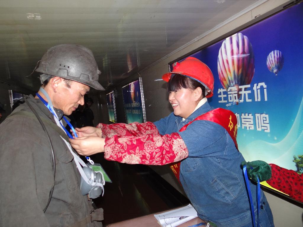 礦嫂服務隊隊員為入井職工佩戴安全提醒卡