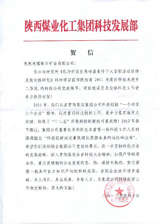 近日,銅川礦業(yè)公司《焦坪礦區(qū)巨厚礫巖條件下大面積活動(dòng)規(guī)律及致災(zāi)性研究》科研項(xiàng)目獲得陜西省2011年度科學(xué)技術(shù)進(jìn)步二等獎(jiǎng)。陜煤化集團(tuán)科技發(fā)展部欣聞公司《焦坪礦區(qū)厚礫巖條件下大面積活動(dòng)規(guī)律及致災(zāi)性研究》榮獲2011年度陜西省科學(xué)技術(shù)二等獎(jiǎng)的消息后,專門給銅川礦業(yè)公司發(fā)來(lái)賀信,向公司黨政領(lǐng)導(dǎo)、項(xiàng)目組成員及全體科技工作者表示熱烈的祝賀。
