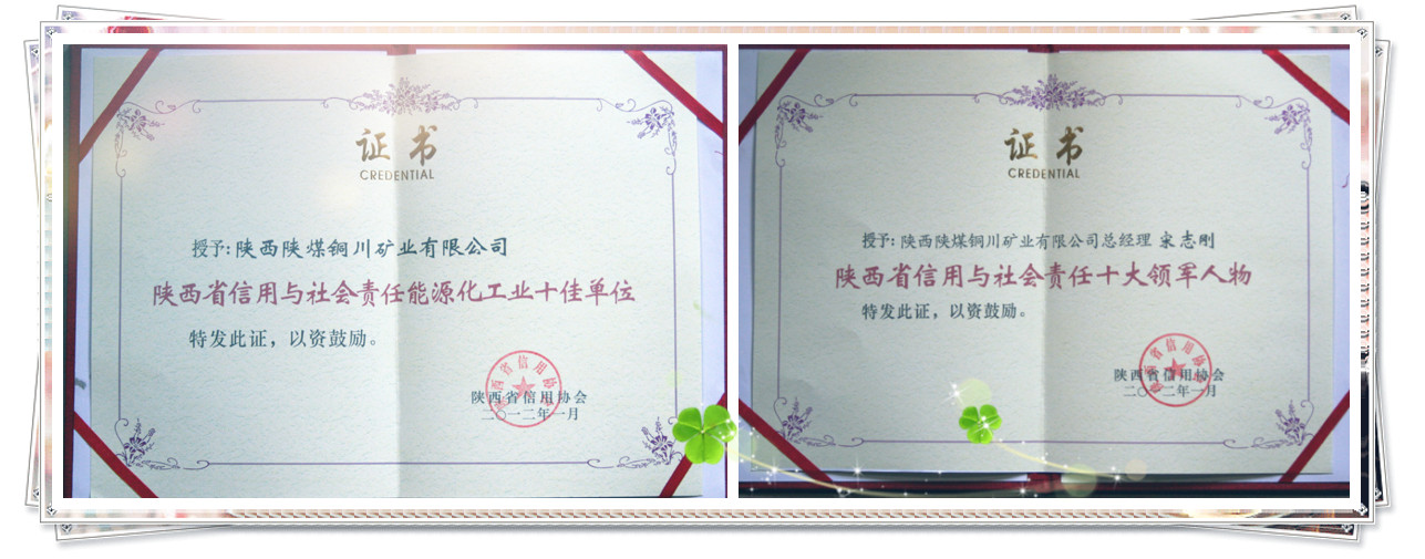 在2012年陜西省信用協(xié)會召開的表彰大會上,銅川礦業(yè)公司榮獲陜西省信用與社會責(zé)任能源化工業(yè)十佳單位,該公司總經(jīng)理宋志剛被評為陜西省信用與社會責(zé)任十大領(lǐng)軍人物。