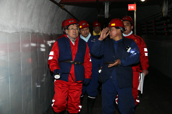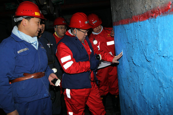 宋志剛總經(jīng)理一行到礦后,帶領(lǐng)隨行人員,在金華山礦礦長(zhǎng)寧文衛(wèi)、黨委書記武永發(fā)陪同下更衣下井。在井下,宋志剛總經(jīng)理檢查了金華山礦的安全生產(chǎn)和礦井質(zhì)量標(biāo)準(zhǔn)化建設(shè),并對(duì)該礦近期安全生產(chǎn)工作給予充分肯定。