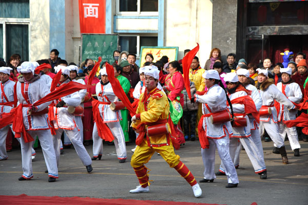 早晨9點半,礦部已是鑼鼓喧天,彩綢飛舞,人頭攢動。社火表演在“恭祝新春、新年吉祥”的賀歲聲中火熱開始。鑼鼓隊,黃衣金鑼聲勢響;舞龍隊,騰挪閃躍嘯長空;紅獅隊,上下翻滾展雄姿;秧歌隊,鶯飛燕舞頌新春。尤其30人組成的安塞腰鼓隊,紅、黃2名領(lǐng)隊對鼓揚彩,花樣百變;眾多白衣?lián)艄捻憫?yīng),紅綢翻飛,豪放縱橫的擊打樂,激