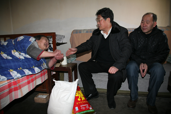 冒著嚴寒,郭寶輝一行首先來到困難職工雷勝凱的家中,親切地詢問老人家的身體現(xiàn)狀,鼓勵老人要對生活充滿信心,困難是暫時的,一定會過去的。當走到老干部喬有勝的家中時,看到病床上已成植物人的喬有勝的妻子,郭寶輝握著老喬同志的手,“感謝你呀,你對老伴的悉心照料,給我們穩(wěn)定工作做出了大的貢獻,不容易呀,真誠感謝?!崩蠁掏炯拥卣f:“我應該感謝領導和社區(qū)呀,在我最困難的時候,是黨和組織幫助了我,為我分擔憂愁,我感謝黨和企業(yè)?。 ?。最后,郭寶輝一行來到病亡遺屬陳英的家中,癱瘓在床多年的老人,拿出珍藏的香煙,一個勁的讓領導們抽,仿佛所有的感激都融在那小小的香煙中。郭寶輝握著老人的手,我代表公司黨政前來看望你們,祝你們新春快樂,身體健康。