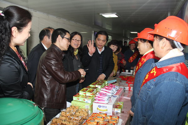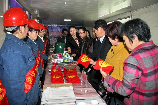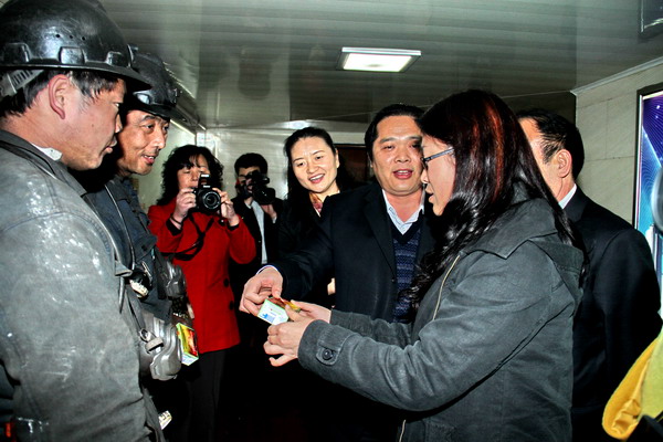 下午3時(shí)許,黨柏峰、梁秀俠一行到礦后,欣聞該礦四點(diǎn)班職工將要更衣入井、八點(diǎn)班的職工即將升井,正是“礦嫂服務(wù)隊(duì)”開(kāi)展活動(dòng)、展現(xiàn)風(fēng)采的時(shí)機(jī)。他們帶著十分好奇與興奮的心情,沒(méi)顧得上考慮休息,就立即趕到井口,投入對(duì)“礦嫂服務(wù)隊(duì)”進(jìn)行現(xiàn)場(chǎng)采訪與親歷她們的活動(dòng)之中。他們經(jīng)過(guò)井口文化長(zhǎng)廊,來(lái)到礦嫂服務(wù)活動(dòng)現(xiàn)場(chǎng),當(dāng)看到一個(gè)個(gè)身披“礦嫂安全親情服務(wù)隊(duì)”標(biāo)志,著裝整齊規(guī)范、滿面笑容,正在為上下井職工熱情服務(wù)的礦嫂們,黨柏峰、梁秀俠一行激動(dòng)地與她們一一握手,向她們問(wèn)好。在活動(dòng)間隙,黨柏峰、梁秀俠一行不失時(shí)機(jī)與礦嫂們和上下井職工親切交談,了解有關(guān)情況。