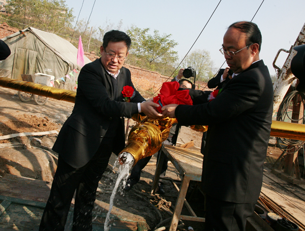 在歡快的樂(lè)曲聲中,礦業(yè)公司總經(jīng)理宋志剛,黨委書記黃河,副總經(jīng)理郭寶輝、劉啟科、封建利以及公司領(lǐng)導(dǎo)張志文,金華山礦礦長(zhǎng)寧文衛(wèi)為水源井竣工剪彩。