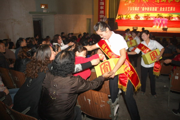 圖為女工安全協(xié)管員在井口為職工送月餅矚語安全生產(chǎn)。