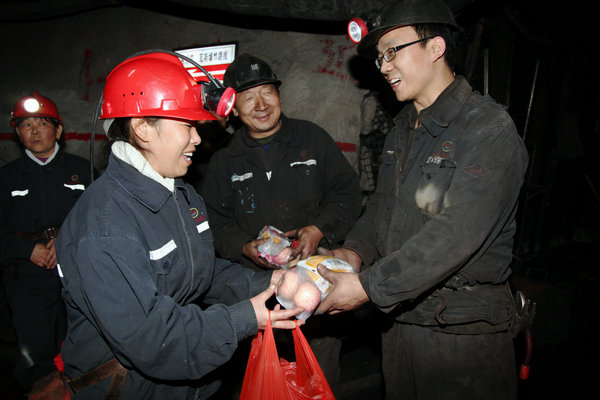 這次參加慰問的12名礦嫂雖長期生活在礦山,但她們對井下一線的生產(chǎn)現(xiàn)狀也不甚了解。在乘坐了半個多小時的人車,一路徒步幾處近200米斜巷和近千米的皮帶巷,大家個個汗流浹背、筋疲力盡,初次下井的新鮮感一掃而光。到達(dá)掘進(jìn)二隊294上順工作面后,礦嫂們立即把裝有月餅、水果的中秋禮包送到了職工手中,同時送上安全囑托,叮囑井下作業(yè)的親人們一定要按章操作,注意安全,受到了工作面干部職工的熱情歡迎。在現(xiàn)場,職工姜繼峰看到自己的妻子滿心歡喜,激動萬分。而妻子看到滿臉征塵,渾身濕透的丈夫,含淚哽咽的說到:“沒想到他每天在井下工作這么辛苦,想想之前下班回家,我還和他找別扭耍小性,真不應(yīng)該,作為妻子以后在家里我一定好好的照顧他,讓他養(yǎng)好精神全心投入每天的辛苦工作”。臨行時,全體礦嫂共同以一曲“十五的月亮”祝福親人,深情的歌聲回蕩在千尺井巷,潮水般的暖流在礦工們內(nèi)心涌動,職工們品嘗著香甜的月餅,感受著礦井領(lǐng)導(dǎo)的關(guān)懷及親人的祝福,一切疲憊都在那一刻化為烏有。