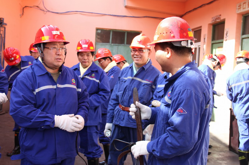 公司總經(jīng)理宋志剛?cè)刖芭c金華山礦礦長寧文衛(wèi)等礦領(lǐng)導(dǎo)親切交談