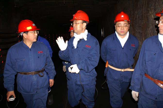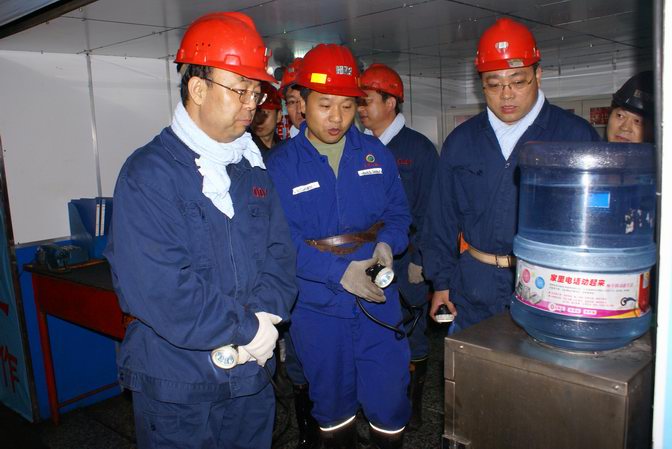 礦業(yè)公司黨委書記黃河一行到礦后,聽取了礦長寧文衛(wèi)、礦黨委書記武永發(fā)對礦井安全、質量標準化、生產生活等方面的匯報。隨后,在礦黨委書記武永發(fā)、礦長寧文衛(wèi)等領導的陪同下,深入井下現(xiàn)場指導工作。乘坐了680人下和570人下兩部架空人車后,黃書記對兩部架空人車的安全運行非常滿意,并同工作人員親切交談,了解職工生產和生活情況。在3603工作面的“超市”里,黃書記一行饒有興趣的查看貨架上的物品,詢問詳細情況,服務人員認真回答井下“超市”的運行情況。得知礦領導給予生活補貼,區(qū)隊領導認真落實,服務人員熱情周到,就餐人員非常滿意,黃河書記高興地說:“在搞好安全生產等工作的同時,要把職工的生活放在首位,創(chuàng)造條件為職工解決力所能及的事情,讓職工吃飽喝好,集中精力,全身心的投入到安全生產中,堅決實現(xiàn)安全‘零’目標,構建和諧新礦區(qū),讓職工享受改革發(fā)展成果,認真達到‘快樂工作、體面生活’!”黃河書記還對安全生產等工作提出了新要求。并對跟隨下井的礦業(yè)公司黨委宣傳部長李德強、質量辦主任李文庭,機電部副部長冉少鋒說:“你們不僅要對基層的企業(yè)文化和質量標準化建設給予指導,還要對他們取得的成績、做法、經驗宣傳出去!”