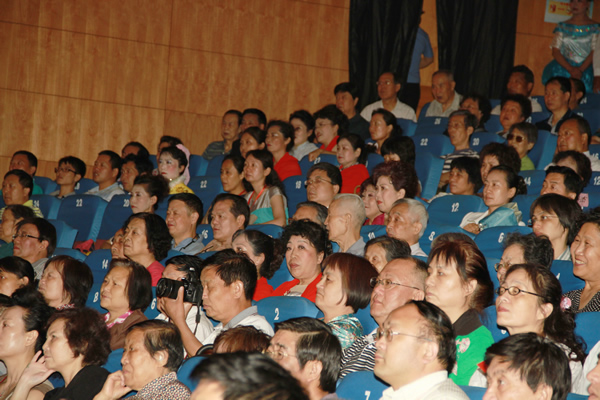 觀眾們凝神聆聽這首由一百人合唱形式演繹的獨唱曲目《紅旗飄飄》
