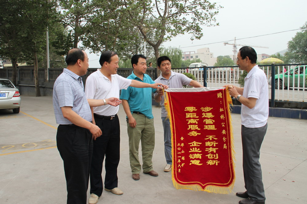 6月22日上午,一串響亮的鞭炮聲在銅川市公安局虹橋分局院內(nèi)響起。大約11時(shí)10分,金華山礦黨委副書記劉貴平、副總工程師、安質(zhì)科科長劉星河、供應(yīng)科科長趙德廣等一行代表礦黨政將書寫“涉爆管理不斷創(chuàng)新 零距離服務(wù)企業(yè)滿意”字樣的鮮紅錦旗送到虹橋公安分局局長趙宏濤手中。