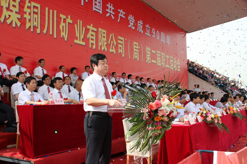 銅川礦業(yè)公司黨委書記黃河致開幕詞,他首先代表銅川礦業(yè)公司黨政工團(tuán)各級(jí)組織,向運(yùn)動(dòng)會(huì)的勝利召開表示熱烈的祝賀!向蒞臨運(yùn)動(dòng)會(huì)開幕式的各位領(lǐng)導(dǎo)、各位來賓表示熱烈的歡迎!向全體運(yùn)動(dòng)員、教練員、裁判員和廣大干部職工致以親切的慰問!黃河指出,近年來,在陜西煤業(yè)化工集團(tuán)公司的正確領(lǐng)導(dǎo)下,在社會(huì)各界和有關(guān)方面的關(guān)心支持下,銅川礦業(yè)公司各級(jí)組織和廣大干部職工堅(jiān)持以科學(xué)發(fā)展觀為統(tǒng)領(lǐng),緊緊圍繞改革、發(fā)展和穩(wěn)定中心工作,集中精力狠抓安全生產(chǎn),全力以赴維護(hù)礦區(qū)穩(wěn)定,深入開展創(chuàng)先爭(zhēng)優(yōu)活動(dòng),努力創(chuàng)建“三型六化”學(xué)習(xí)型企業(yè),積極實(shí)施文化強(qiáng)企戰(zhàn)略,民生工程建設(shè)成效顯著,礦區(qū)文明建設(shè)協(xié)調(diào)發(fā)展,各項(xiàng)工作穩(wěn)步推進(jìn),樹立了良好企業(yè)形象。