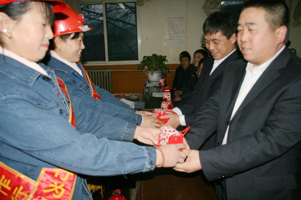 礦嫂把一份份禮品送到節(jié)日?qǐng)?jiān)持在工作崗位上的員工
