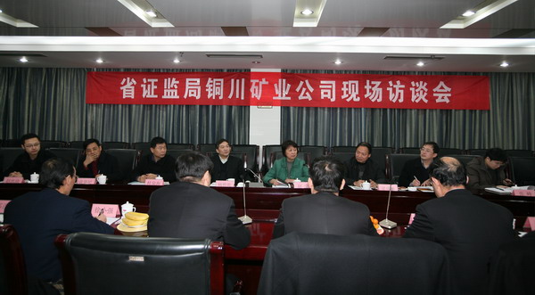2月18日上午十點(diǎn),在銅川礦業(yè)公司煤業(yè)賓館二樓會(huì)議室召開(kāi)了省證監(jiān)局銅川礦業(yè)公司現(xiàn)場(chǎng)訪談會(huì).省證監(jiān)局副局長(zhǎng)趙瑩、陜煤化集團(tuán)公司副總經(jīng)理?xiàng)钫涨?、中銀國(guó)際證劵有限責(zé)任公司、中國(guó)國(guó)際金融有限公司、中信證劵股份有限公司等一行14人和銅川礦業(yè)公司執(zhí)行董事、總經(jīng)理宋志剛,黨委副書(shū)記、副總經(jīng)理黃河,副總經(jīng)理薛鳴、封建利, 以及公司設(shè)19個(gè)管理部室的負(fù)責(zé)人參加了訪談會(huì)。