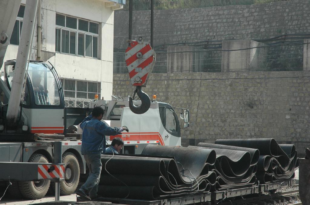 施工巷道坡度24.5度,新皮帶全長2350米,帶寬1.4米,厚2.25厘米,1米重75公斤,整個(gè)皮帶全重是165噸;導(dǎo)向滾筒長2米,直徑1.5米,重達(dá)11.4噸。