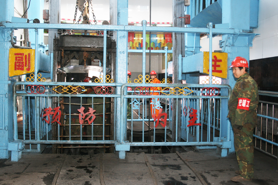 職工乘坐罐籠高高興興入井